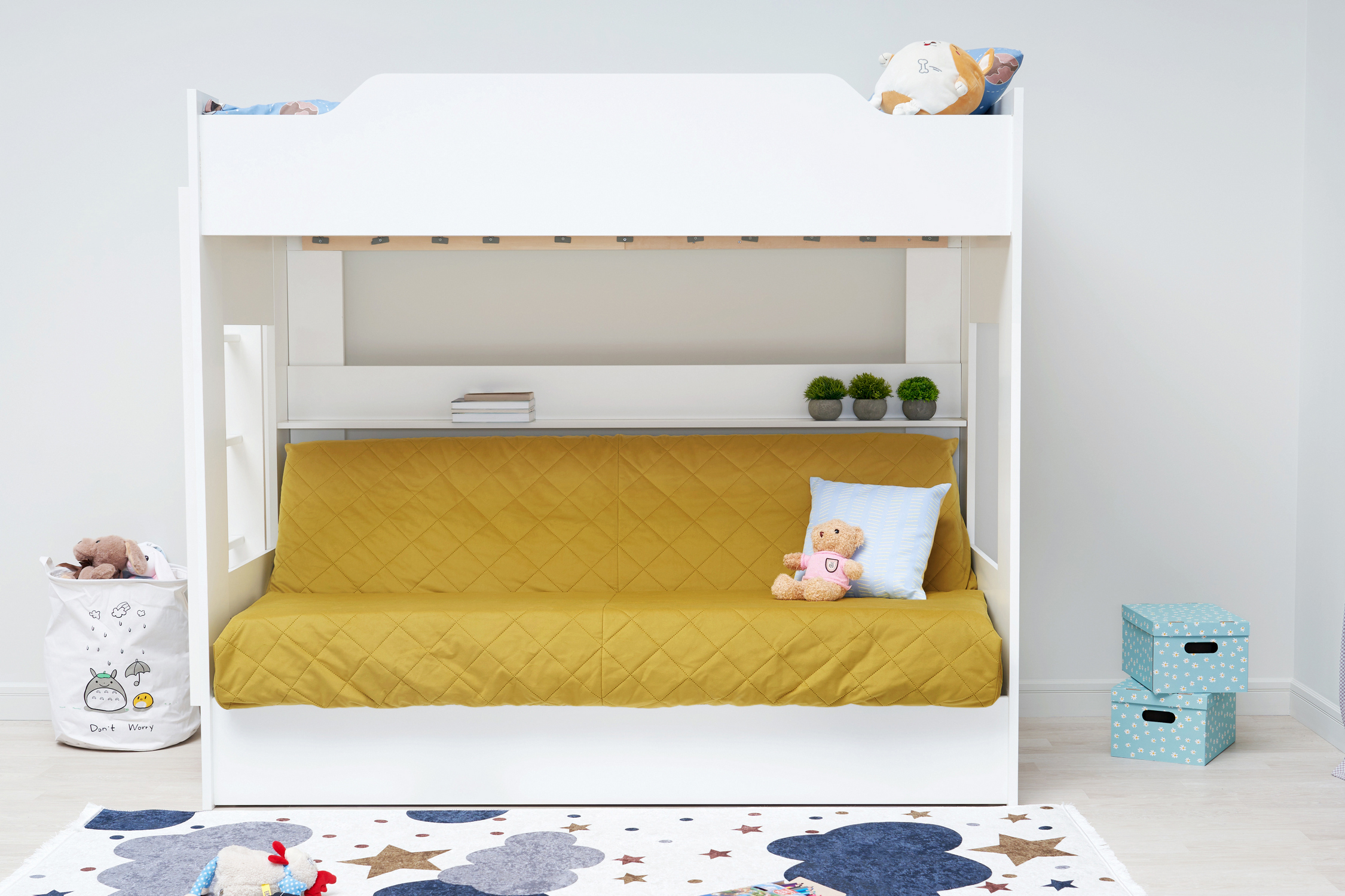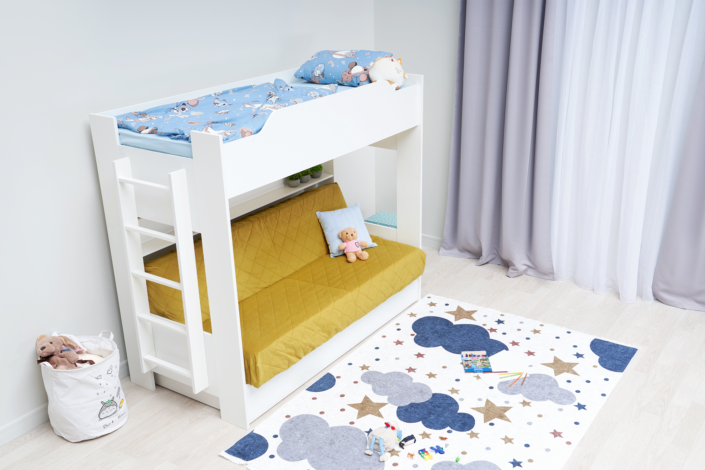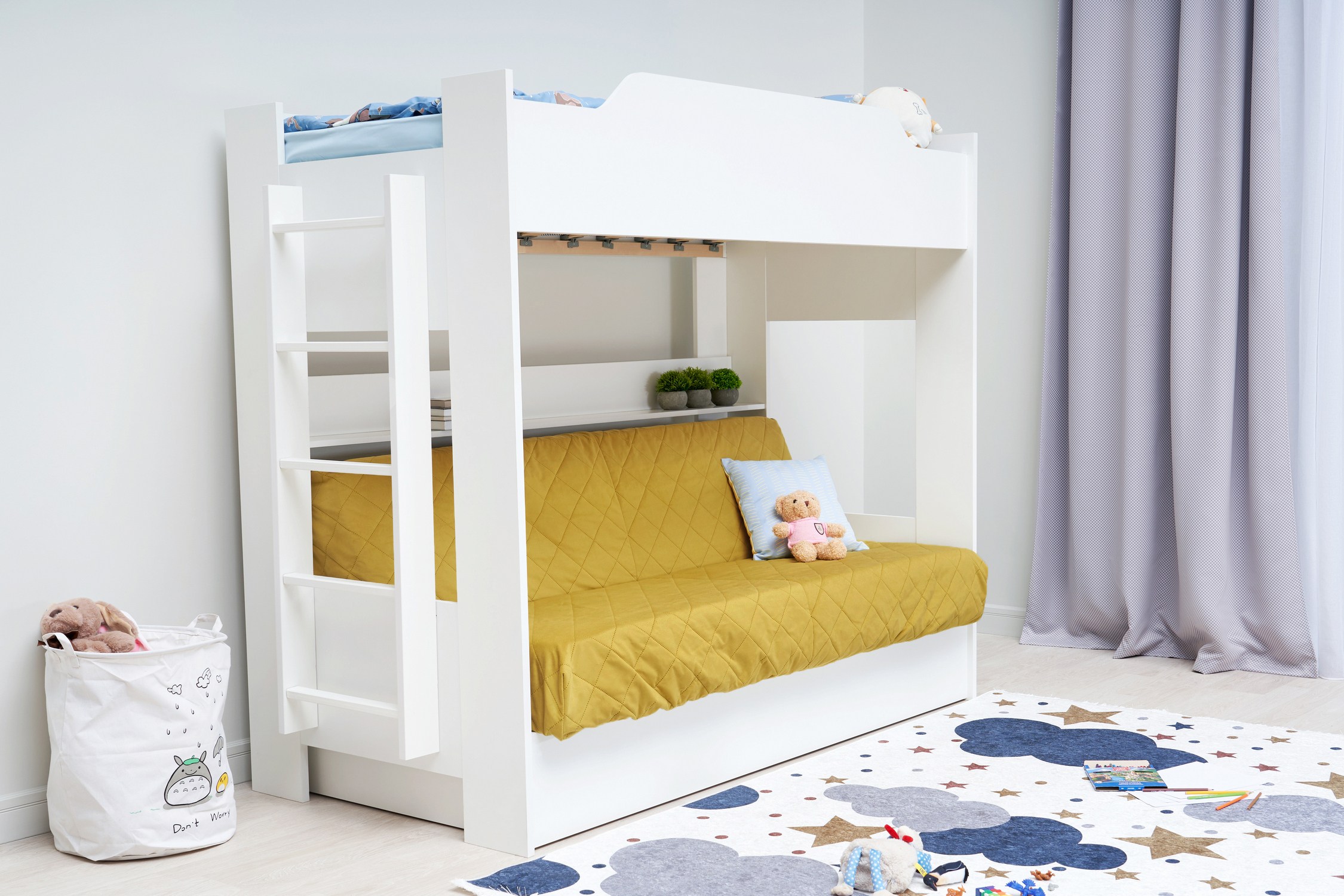 Механизм трансформации дивана: «Книжка». Рекомендуемая высота матраса на верхний ярус 17 см. Максимальная нагрузка на верхний ярус 50 кг. Лестница может быть установлена с обеих сторон кровати. Высота бортика 30 см. Максимальная нагрузка на нижний ярус 90 кг. Чехол съемный.